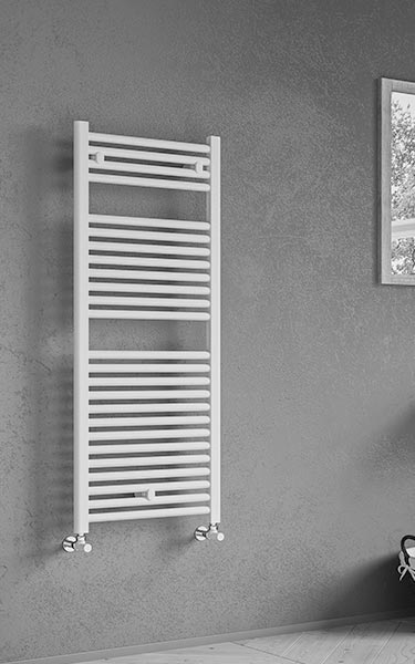 Scaldasalviette da bagno in acciaio con collettori laterali a forma di “D” 40x30 mm e tubo tondo orizzontale dal diametro di 25 mm saldobrasato nelle varianti dritto o curvo. Mensole ovali, tre nella variante dritto, quattro nella variante curvo.