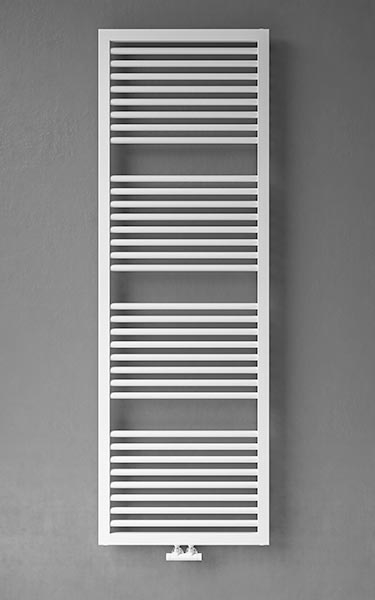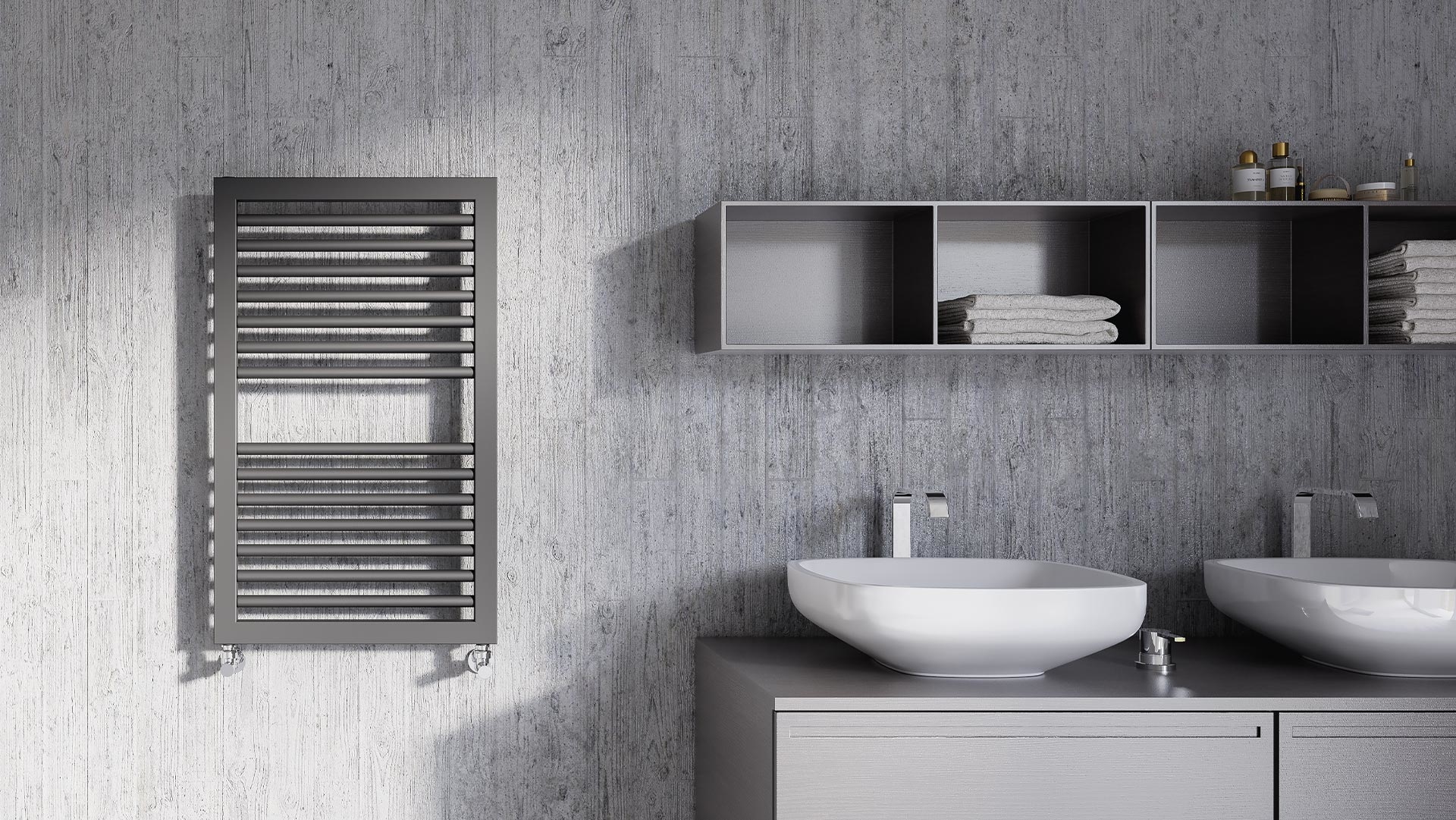 Scaldasalviette da bagno in acciaio con collettori laterali rettangolari 40x30 mm e tubo tondo orizzontale dal diametro di 22 mm saldobrasato. Mensole nascoste.