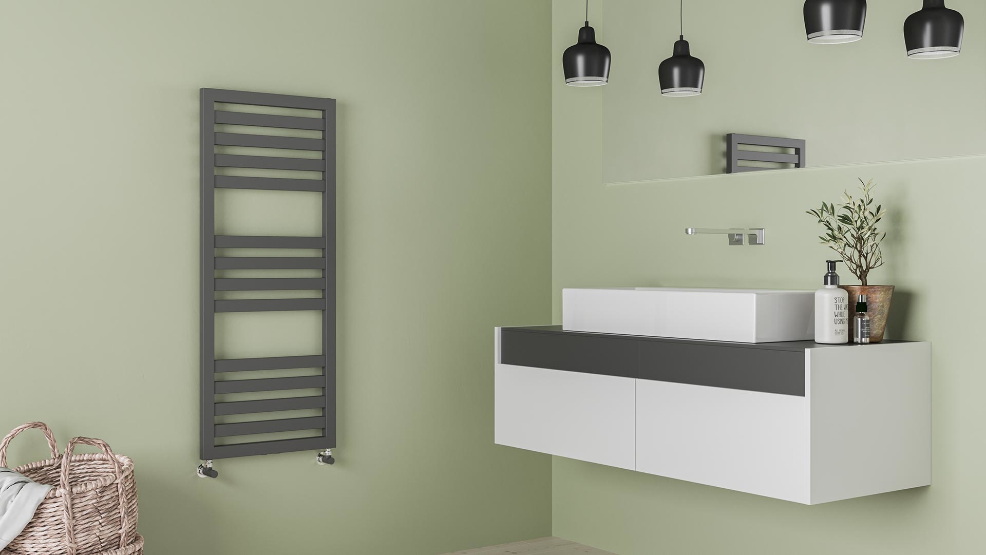 Scaldasalviette da bagno in acciaio con collettori laterali rettangolari 40x30 mm e tubo piatto orizzontale 20x40 mm saldobrasato. Mensole nascoste.