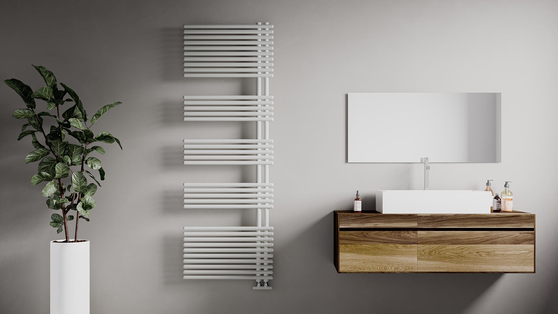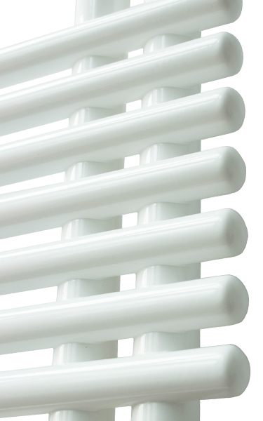 Scaldasalviette da bagno in acciaio con collettori laterali tondi dal diametro di 35 mm e tubo tondo orizzontale dal diametro di 25 mm saldobrasato. La particolarità è il punto d’incontro tra collettore e tubi orizzontali che non si sovrappongono ma si intersecano tra loro. Mensole nascoste.