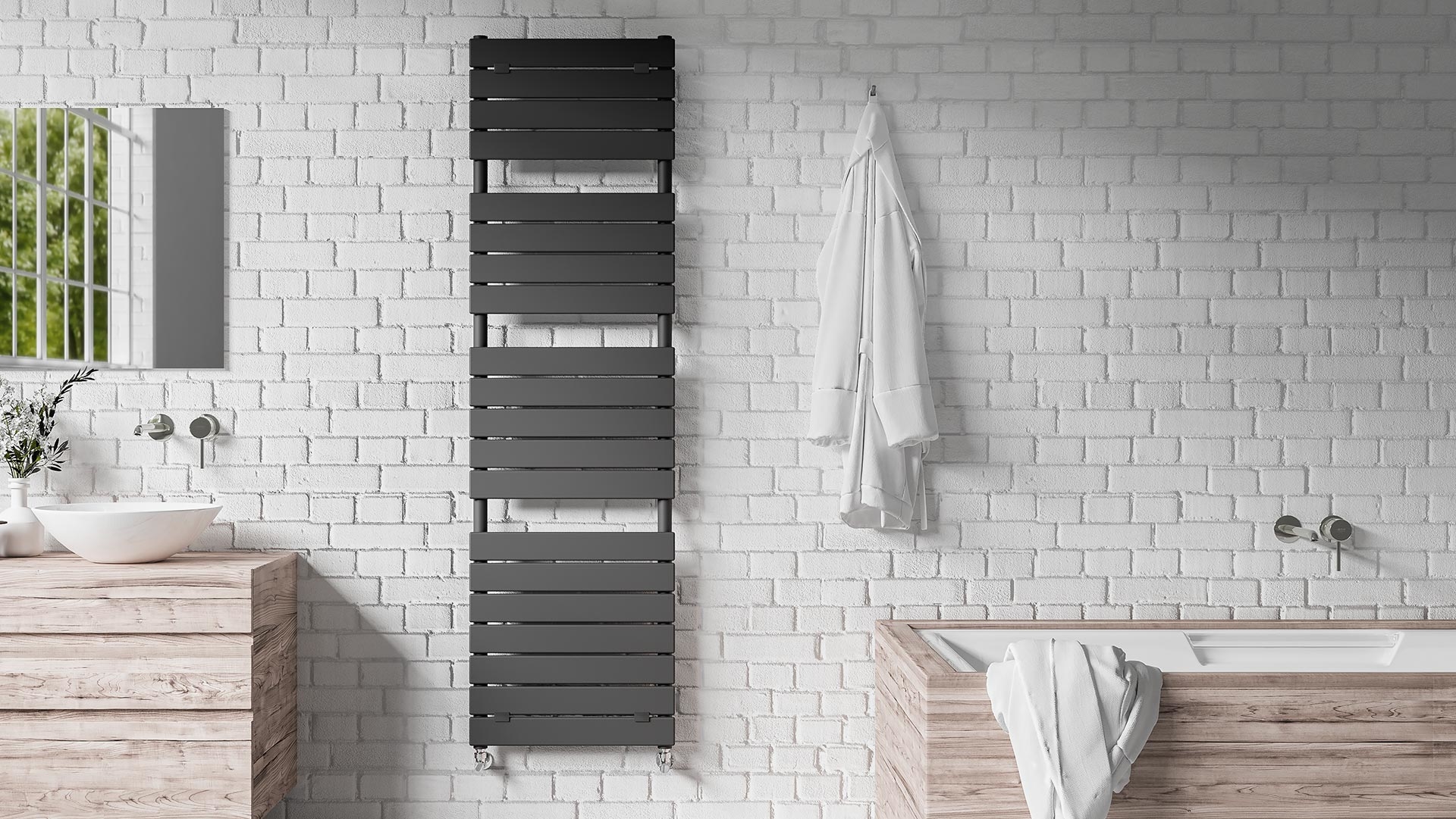 Scaldasalviette da bagno in acciaio con collettori laterali tondi dal diametro di 35 mm e tubo piatto dritto orizzontale 70x11 mm saldobrasato. Quattro mensole rettangolari.