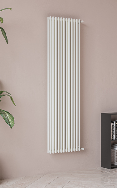 Radiatore d'arredo in acciaio con collettori tondi orizzontali dal diametro di 35 mm e tubi tondi verticali dal diametro di 22 mm in fila singola o doppia. Mensole nascoste.
