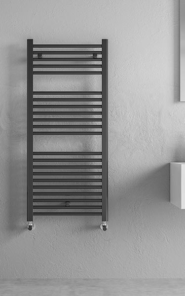 Handtuchtrockner fürs Bad aus Stahl mit D-förmigen Seitenkollektoren 40 x 30 mm und horizontalem Rundrohr mit 22 mm Durchmesser, gelötet, in gerader oder gebogener Ausführung. Ovale Befestigungskonsolen, drei in der geraden, vier in der gebogenen Ausführung.