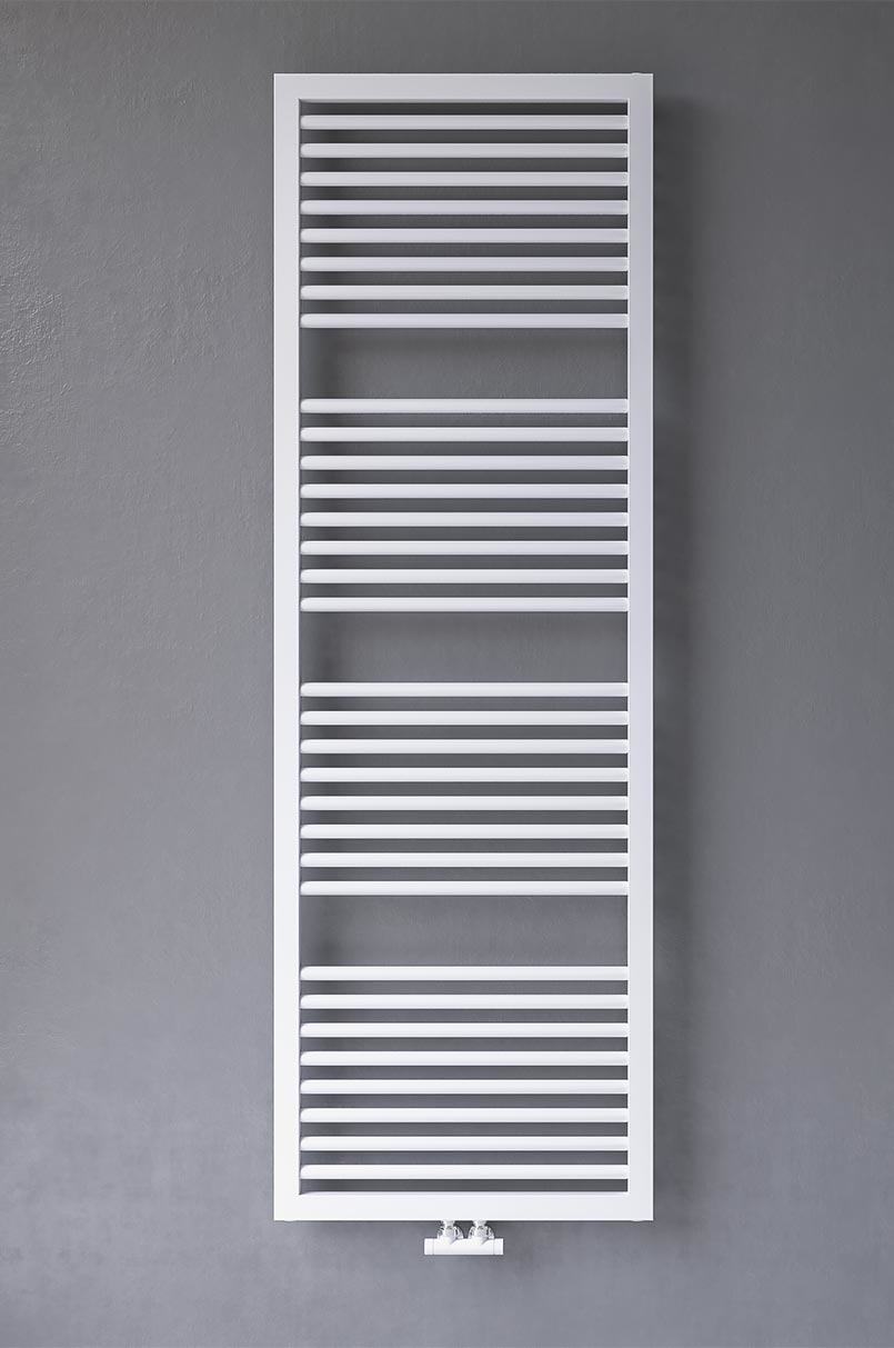 Handtuchtrockner fürs Bad aus Stahl mit rechteckigen Seitenkollektoren 40 x 30 mm und horizontalem Flachrohr 20 mm x 40 mm, gelötet. Keine sichtbare Befestigungskonsole.