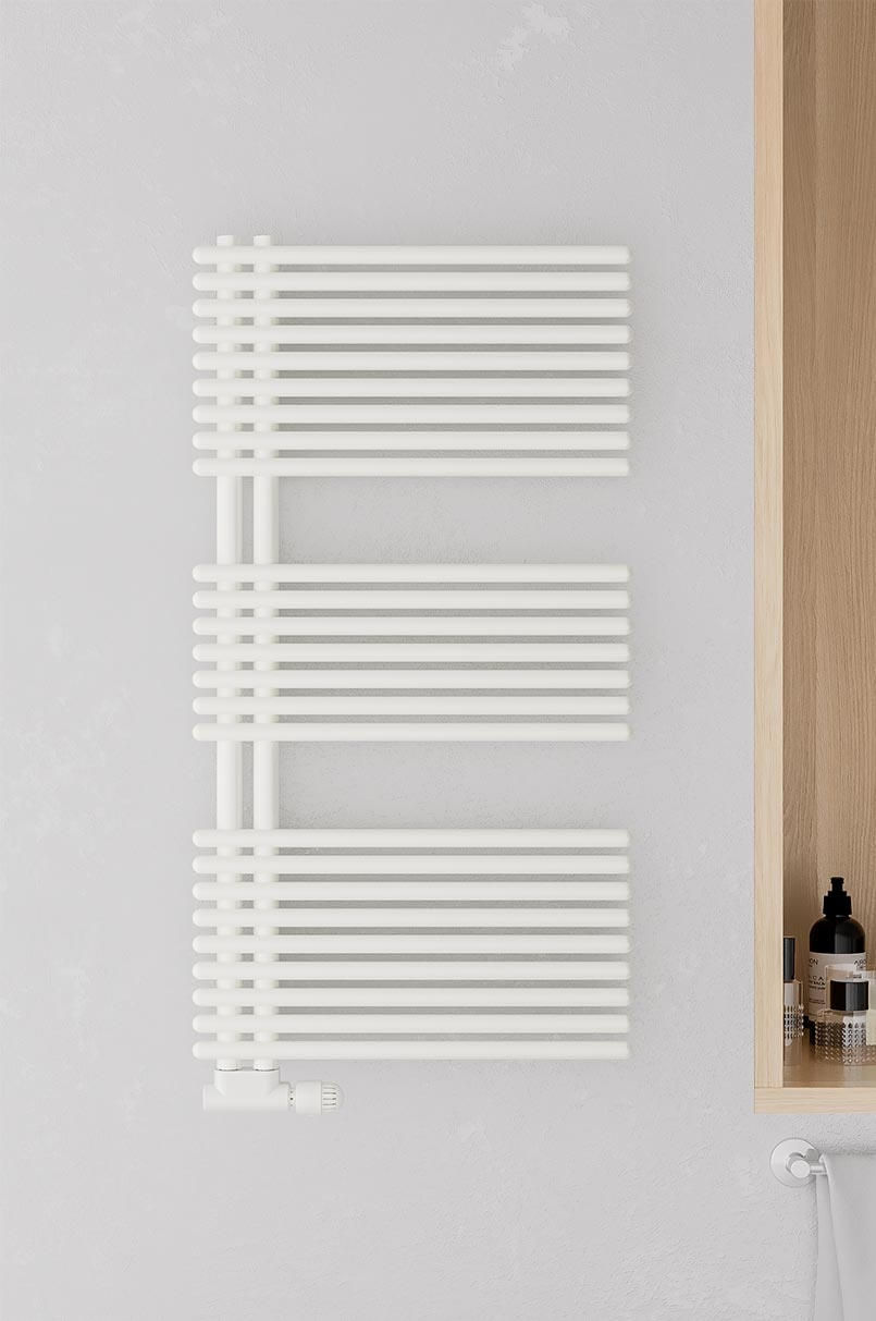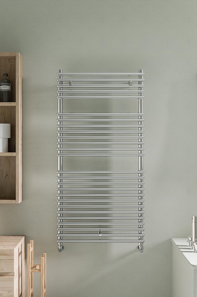 Handtuchtrockner fürs Bad aus Stahl mit runden Seitenkollektoren Durchmesser 35 mm und horizontalem Rundrohr Durchmesser 25 mm, gelötet. Die Besonderheit ist der Verbindungspunkt zwischen Kollektor und horizontalen Rohren, die sich nicht überlagern, sondern kreuzen. Keine sichtbare Befestigungskonsole.