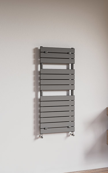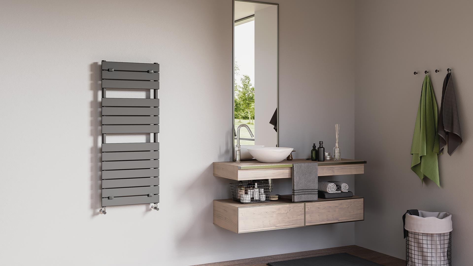 Handtuchtrockner fürs Bad aus Stahl mit runden Seitenkollektoren mit 35 mm Durchmesser und horizontalem geradem Flachrohr 70 x 11 mm, gelötet. Vier rechteckige Befestigungskonsolen.