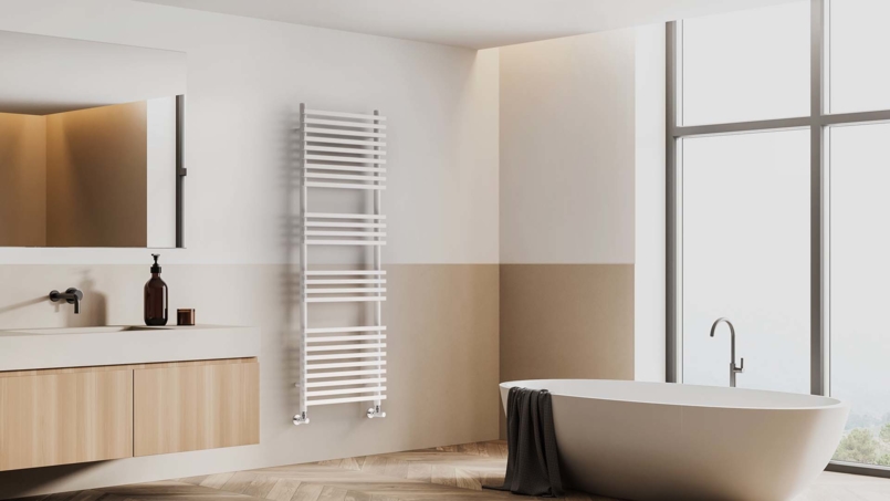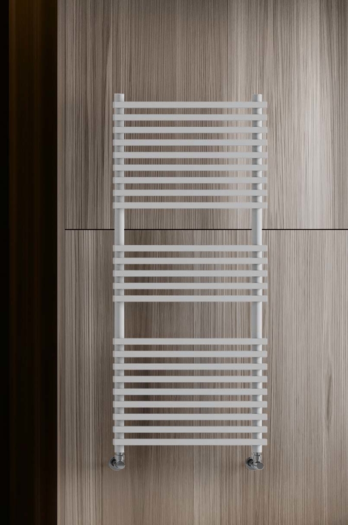 Handtuchtrockner fürs Bad aus Stahl mit Rundrohr-kollektoren 35 mm und 20x20 mm viereckiege Rohr. Keine sichtbare Befestigungskonsole.