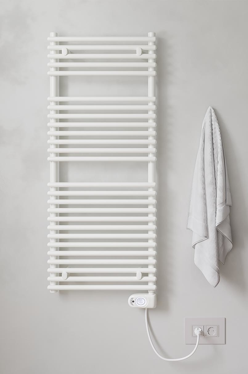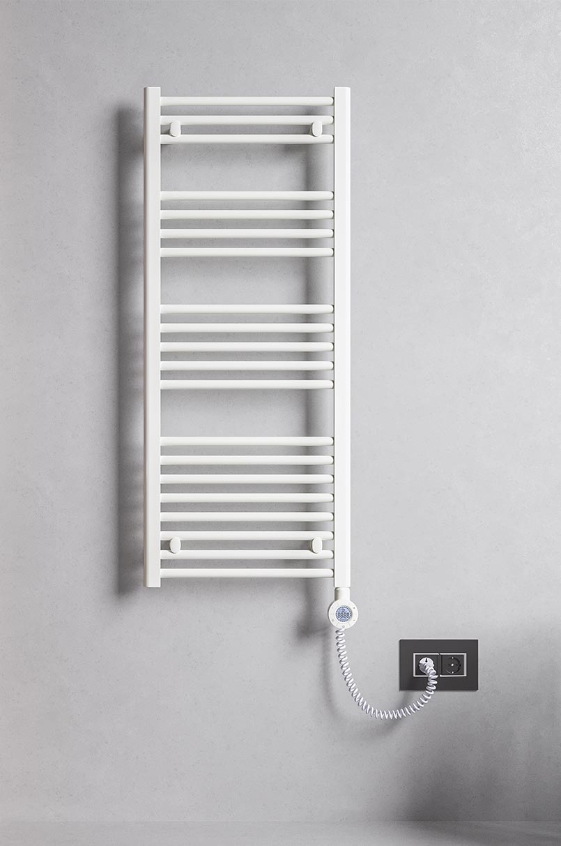 Elektrischer Bad-Handtuchtrockner aus Stahl mit D-förmigen Seitenkollektoren 40 x 30 mm und horizontalem Rundrohr Durchmesser 22 mm, gelötet. Vier ovale Befestigungskonsolen.