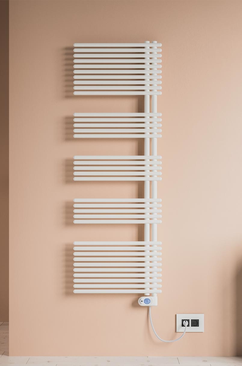 Handtuchtrockner fürs Bad aus Stahl mit runden Seitenkollektoren Durchmesser 35 mm und horizontalem Rundrohr Durchmesser 25 mm, gelötet. Die Besonderheit ist der Verbindungspunkt zwischen Kollektor und horizontalen Rohren, die sich nicht überlagern, sondern kreuzen. Keine sichtbare Befestigungskonsole.