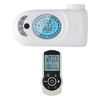 Der hintergrundbeleuchtete Thermostat ist integriert. Die Verbindung mit der Steckdose erfolgt per Schukostecker und ein ca. 1 m langes Kabel. Erhältliches Zubehör: Fernbedienung zur Remote-Steuerung.