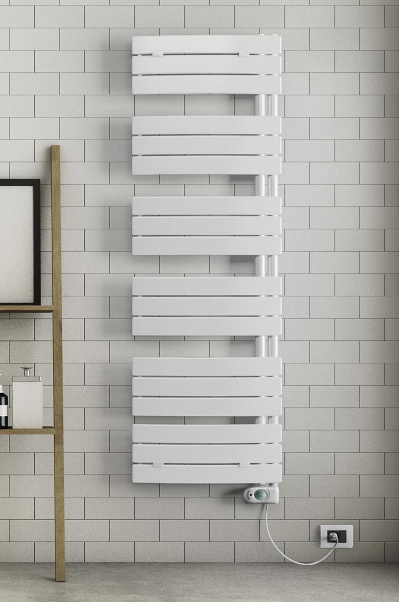 Handtuchtrockner fürs Bad aus Stahl mit runden Seitenkollektoren Durchmesser 38 mm und horizontalem gebogenem Flachrohr 70 x 11 mm, gelötet. Vier rechteckige Befestigungskonsolen.