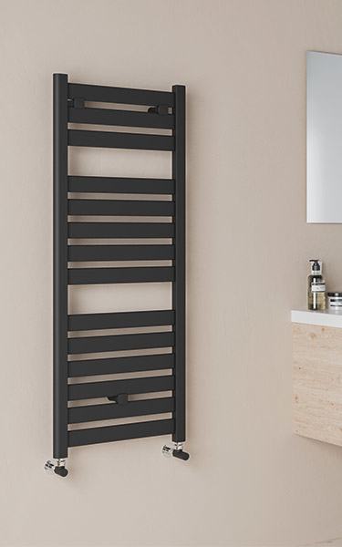 Carbon steel towel warmer with D-shaped side collectors (40x30 mm) and braze-welded horizontal straight flat pipe (50x10 mm). Three rectangular brackets.