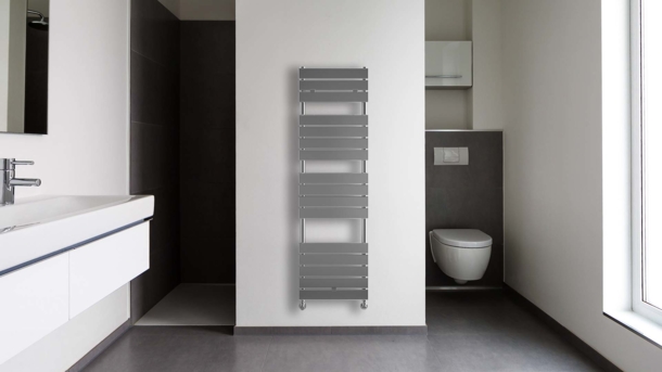 Carbon steel towel warmer with 35 mm diameter round side collector and braze-welded horizontal straight flat pipe (70x11 mm). Three brackets.