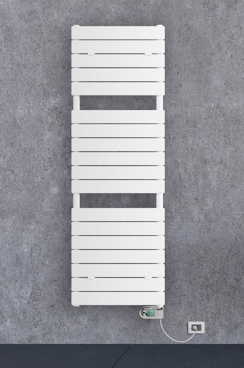 Carbon steel towel warmer with 35 mm diameter round side collectors and braze-welded horizontal straight flat pipe (70x11 mm). Four rectangular brackets.