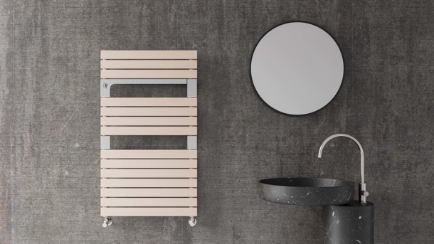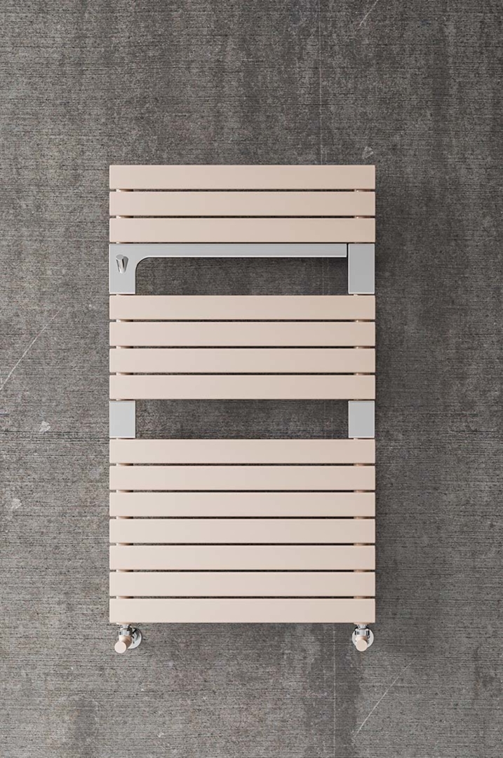 Carbon steel towel warmer with 35 mm diameter round side collector and braze-welded horizontal straight flat pipe (50x10 mm). Four rectangular brackets.