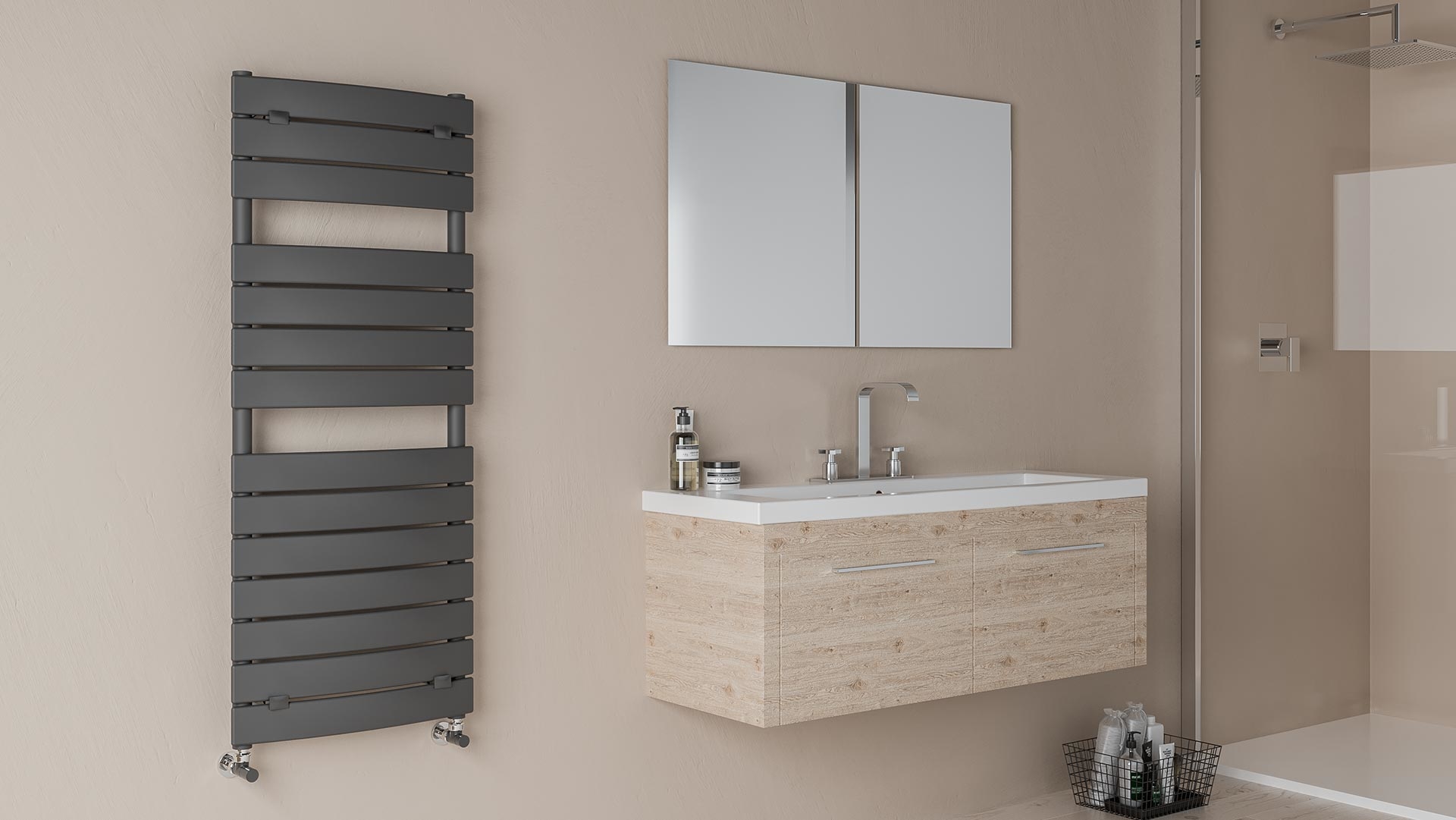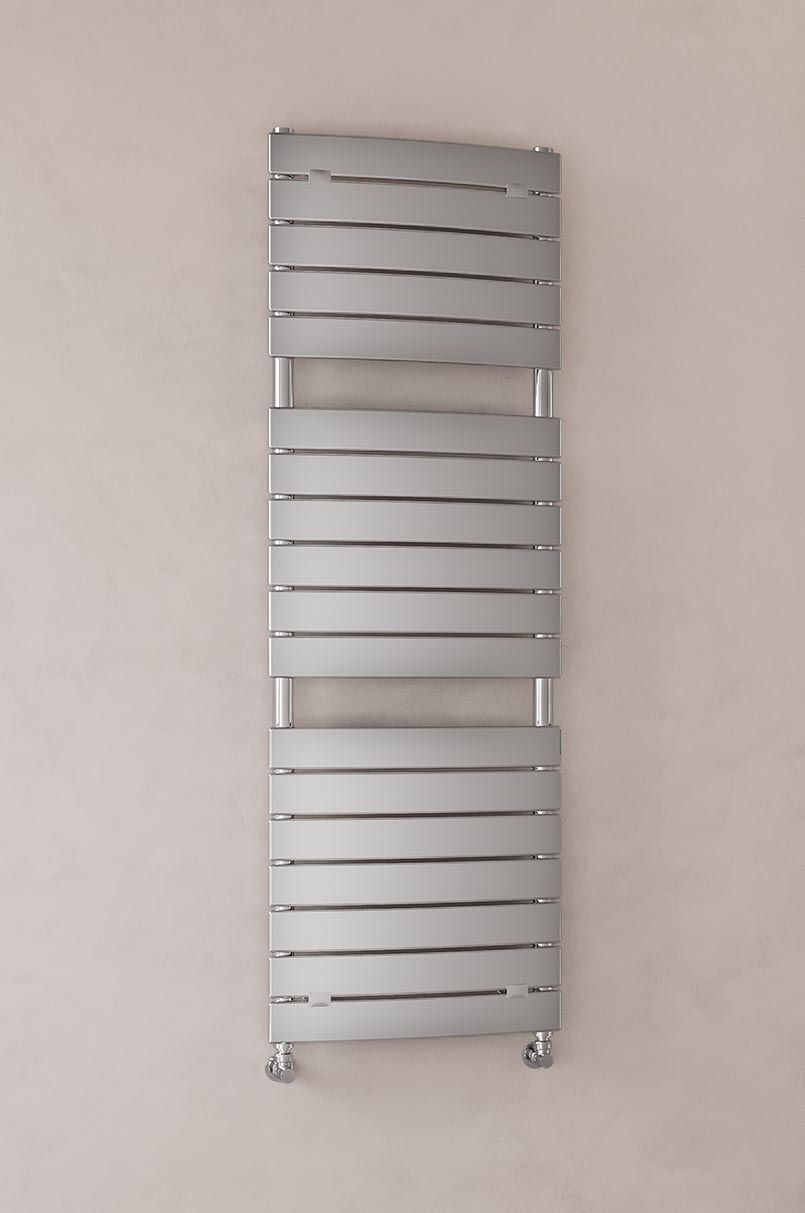 Carbon steel towel warmer with 35 mm diameter round side collectors and braze-welded horizontal curved flat pipe (70x11 mm). Four rectangular brackets.