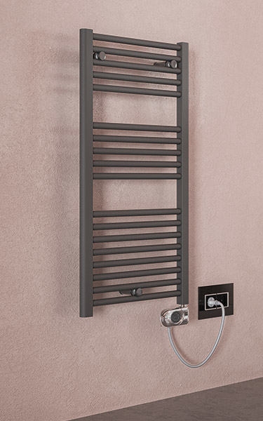 Carbon steel electric towel warmer with D-shaped side collectors (40x30mm) and braze-welded 22 mm diameter horizontal round straight pipe. Three round brackets.