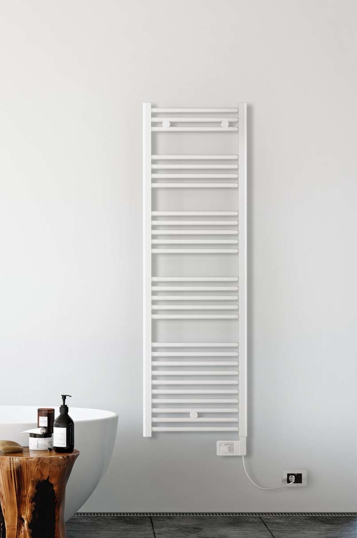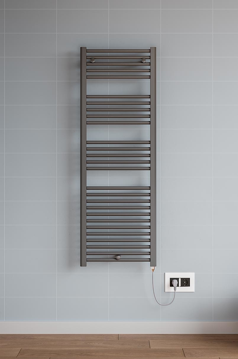 Carbon steel electric towel warmer with D-shaped side collectors (40x30mm) and braze-welded 22 mm diameter horizontal round straight pipe. Three round brackets.