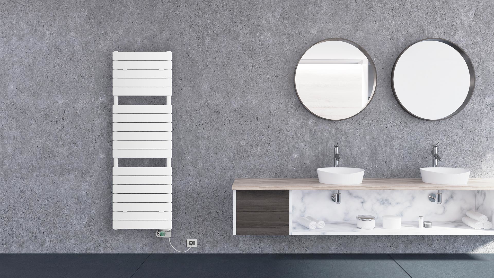 Built-in backlit thermostat. Mains connection via Schuko plug and cable (about 1 metre long). Optional remote control.