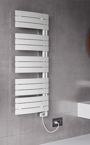 Built-in backlit thermostat. Mains connection via Schuko plug and cable (about 1 metre long). Optional remote control.
